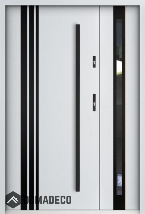 La porte est en acier inoxydable. À l'intérieur, il est rempli de mousse polyuréthane PUR et de bois. L'épaisseur du vantail de porte est de 55 mm. Double système d'étanchéité - un joint est dans le seuil du cadre et l'autre est situé dans la partie de support du vantail de porte. Ils réduisent les vibrations et protègent votre maison contre la perte de chaleur. Ils ne changent pas de volume sous l'influence des conditions atmosphériques. Le cadre de la porte est doté de renforts anti-effraction dans les pièces de charnière et les points de verrouillage.