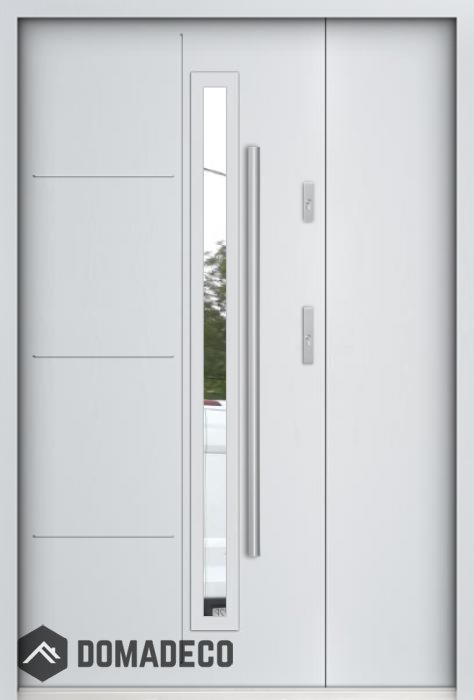 La porte est en acier inoxydable. À l'intérieur, il est rempli de mousse polyuréthane PUR et de bois. L'épaisseur du vantail de porte est de 55 mm. Double système d'étanchéité - un joint est dans le seuil du cadre et l'autre est situé dans la partie de support du vantail de porte. Ils réduisent les vibrations et protègent votre maison contre la perte de chaleur. Ils ne changent pas de volume sous l'influence des conditions atmosphériques. Le cadre de la porte est doté de renforts anti-effraction dans les pièces de charnière et les points de verrouillage.