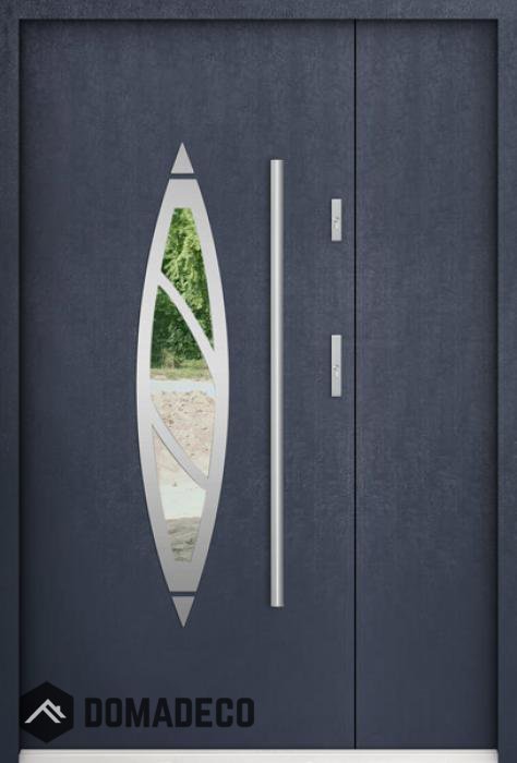 La porte est en acier inoxydable. À l'intérieur, il est rempli de mousse polyuréthane PUR et de bois. L'épaisseur du vantail de porte est de 55 mm. Double système d'étanchéité - un joint est dans le seuil du cadre et l'autre est situé dans la partie de support du vantail de porte. Ils réduisent les vibrations et protègent votre maison contre la perte de chaleur. Ils ne changent pas de volume sous l'influence des conditions atmosphériques. Le cadre de la porte est doté de renforts anti-effraction dans les pièces de charnière et les points de verrouillage.