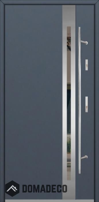 La porte est fabriquée à partir d’acier inoxydable. La structure est remplie de mousse de polyuréthane PUR et de bois. Le vantail de la porte a une épaisseur de 64 mm. Système d'étanchéité double - un joint se situe au fond de la feuillure du cadre et l'autre se situe dans l’élément porteur du vantail de la porte. Ces joints réduisent les vibrations et protègent votre maison des déperditions de chaleur. Ils conservent le même volume, quelles que soient les conditions atmosphériques. Le cadre de la porte est pourvu de renforts antieffraction qui se situent à proximité des charnières et des points de verrouillage.