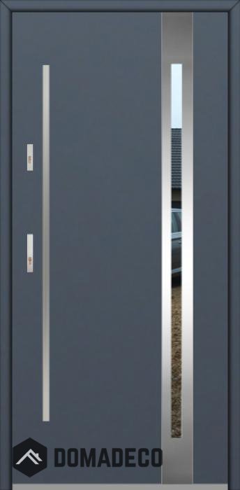 La porte est fabriquée à partir d’acier inoxydable. La structure est remplie de mousse de polyuréthane PUR et de bois. Le vantail de la porte a une épaisseur de 64 mm. Système d'étanchéité double - un joint se situe au fond de la feuillure du cadre et l'autre se situe dans l’élément porteur du vantail de la porte. Ces joints réduisent les vibrations et protègent votre maison des déperditions de chaleur. Ils conservent le même volume, quelles que soient les conditions atmosphériques. Le cadre de la porte est pourvu de renforts antieffraction qui se situent à proximité des charnières et des points de verrouillage.