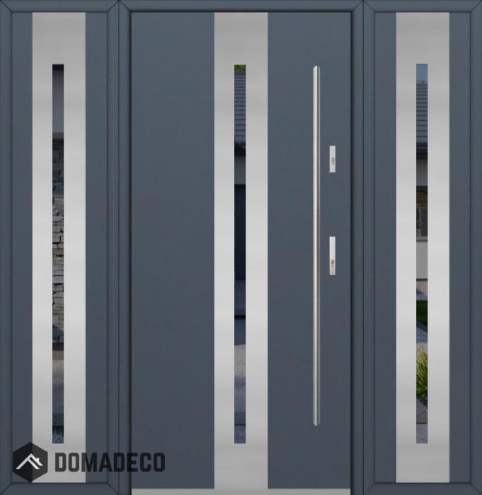 La porte est fabriquée à partir d’acier inoxydable. La structure est remplie de mousse de polyuréthane PUR et de bois. Le vantail de la porte a une épaisseur de 54 mm. Système d'étanchéité double - un joint se situe au fond de la feuillure du cadre et l'autre se situe dans l’élément porteur du vantail de la porte. Ces joints réduisent les vibrations et protègent votre maison des déperditions de chaleur. Ils conservent le même volume, quelles que soient les conditions atmosphériques. Le cadre de la porte est pourvu de renforts antieffraction qui se situent à proximité des charnières et des points de verrouillage.