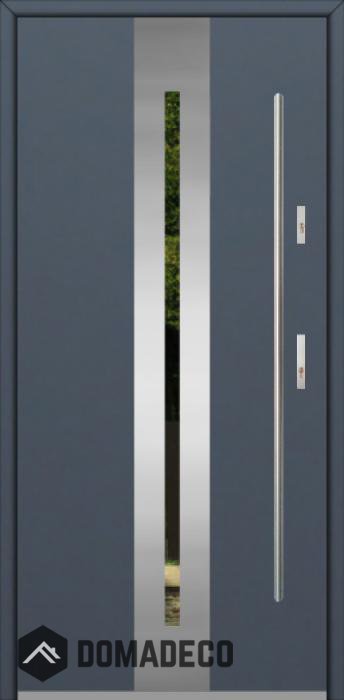 La porte est fabriquée à partir d’acier inoxydable. La structure est remplie de mousse de polyuréthane PUR et de bois. Le vantail de la porte a une épaisseur de 64 mm. Système d'étanchéité double - un joint se situe au fond de la feuillure du cadre et l'autre se situe dans l’élément porteur du vantail de la porte. Ces joints réduisent les vibrations et protègent votre maison des déperditions de chaleur. Ils conservent le même volume, quelles que soient les conditions atmosphériques. Le cadre de la porte est pourvu de renforts antieffraction qui se situent à proximité des charnières et des points de verrouillage.
