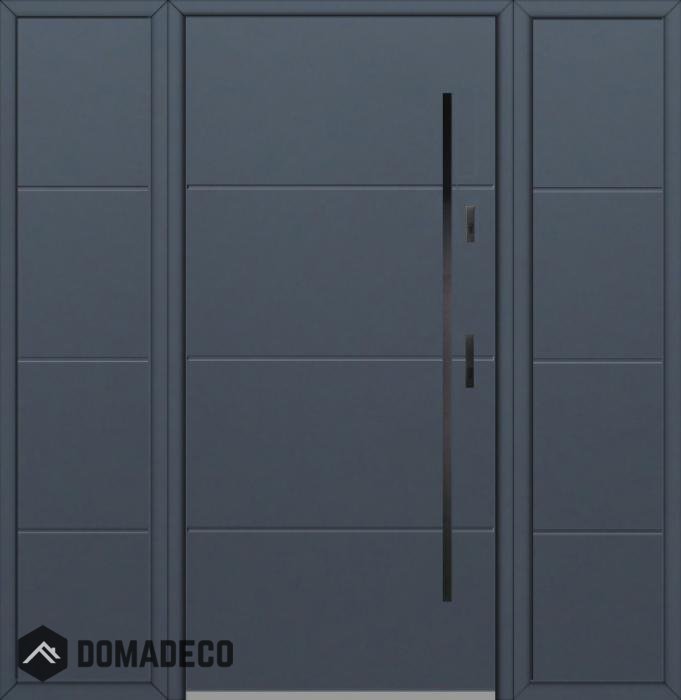 La porte est fabriquée à partir d’acier inoxydable. La structure est remplie de mousse de polyuréthane PUR et de bois. Le vantail de la porte a une épaisseur de 54 mm. Système d'étanchéité double - un joint se situe au fond de la feuillure du cadre et l'autre se situe dans l’élément porteur du vantail de la porte. Ces joints réduisent les vibrations et protègent votre maison des déperditions de chaleur. Ils conservent le même volume, quelles que soient les conditions atmosphériques. Le cadre de la porte est pourvu de renforts antieffraction qui se situent à proximité des charnières et des points de verrouillage.
