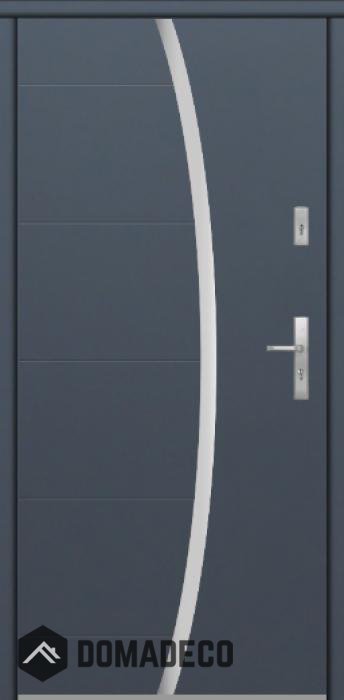 La porte est fabriquée à partir d’acier inoxydable. La structure est remplie de mousse de polyuréthane PUR et de bois. Le vantail de la porte a une épaisseur de 64 mm. Système d'étanchéité double - un joint se situe au fond de la feuillure du cadre et l'autre se situe dans l’élément porteur du vantail de la porte. Ces joints réduisent les vibrations et protègent votre maison des déperditions de chaleur. Ils conservent le même volume, quelles que soient les conditions atmosphériques. Le cadre de la porte est pourvu de renforts antieffraction qui se situent à proximité des charnières et des points de verrouillage.
