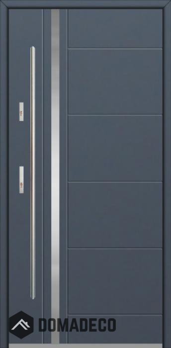 La porte est fabriquée à partir d’acier inoxydable. La structure est remplie de mousse de polyuréthane PUR et de bois. Le vantail de la porte a une épaisseur de 64 mm. Système d'étanchéité double - un joint se situe au fond de la feuillure du cadre et l'autre se situe dans l’élément porteur du vantail de la porte. Ces joints réduisent les vibrations et protègent votre maison des déperditions de chaleur. Ils conservent le même volume, quelles que soient les conditions atmosphériques. Le cadre de la porte est pourvu de renforts antieffraction qui se situent à proximité des charnières et des points de verrouillage.