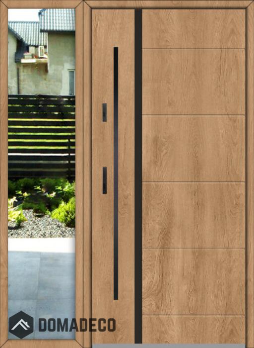 La porte est en acier inoxydable. À l'intérieur, il est rempli de mousse polyuréthane PUR et de bois. L'épaisseur du vantail de porte est de 54 mm. Double système d'étanchéité - un joint est dans le seuil du cadre et l'autre est situé dans la partie de support du vantail de porte. Ils réduisent les vibrations et protègent votre maison contre la perte de chaleur. Ils ne changent pas de volume sous l'influence des conditions atmosphériques. Le cadre de la porte est doté de renforts anti-effraction dans les pièces de charnière et les points de verrouillage.
