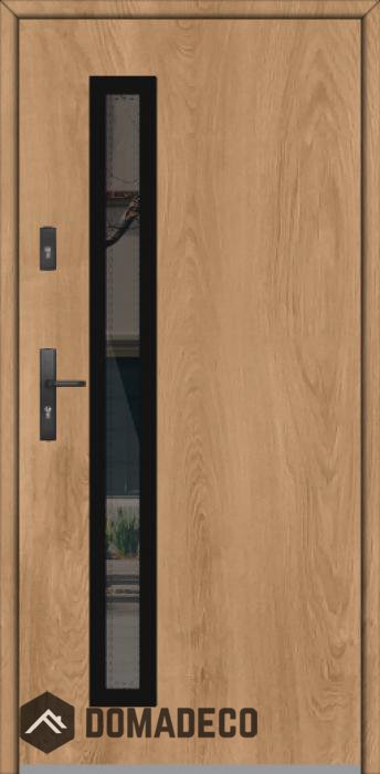 La porte est fabriquée à partir d’acier inoxydable. Elle contient de la mousse et du bois.