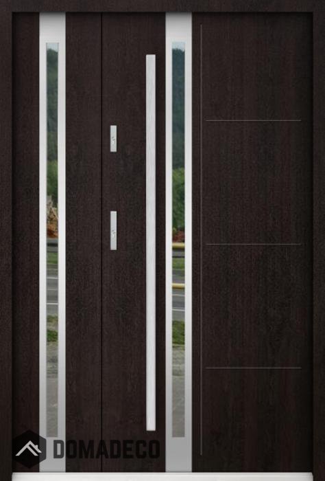 La porte est en acier inoxydable. À l'intérieur, il est rempli de mousse polyuréthane PUR et de bois. L'épaisseur du vantail de porte est de 55 mm. Double système d'étanchéité - un joint est dans le seuil du cadre et l'autre est situé dans la partie de support du vantail de porte. Ils réduisent les vibrations et protègent votre maison contre la perte de chaleur. Ils ne changent pas de volume sous l'influence des conditions atmosphériques. Le cadre de la porte est doté de renforts anti-effraction dans les pièces de charnière et les points de verrouillage.