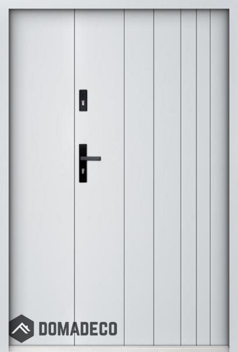 La porte est en acier inoxydable. À l'intérieur, il est rempli de mousse polyuréthane PUR et de bois. L'épaisseur du vantail de porte est de 55 mm. Double système d'étanchéité - un joint est dans le seuil du cadre et l'autre est situé dans la partie de support du vantail de porte. Ils réduisent les vibrations et protègent votre maison contre la perte de chaleur. Ils ne changent pas de volume sous l'influence des conditions atmosphériques. Le cadre de la porte est doté de renforts anti-effraction dans les pièces de charnière et les points de verrouillage.