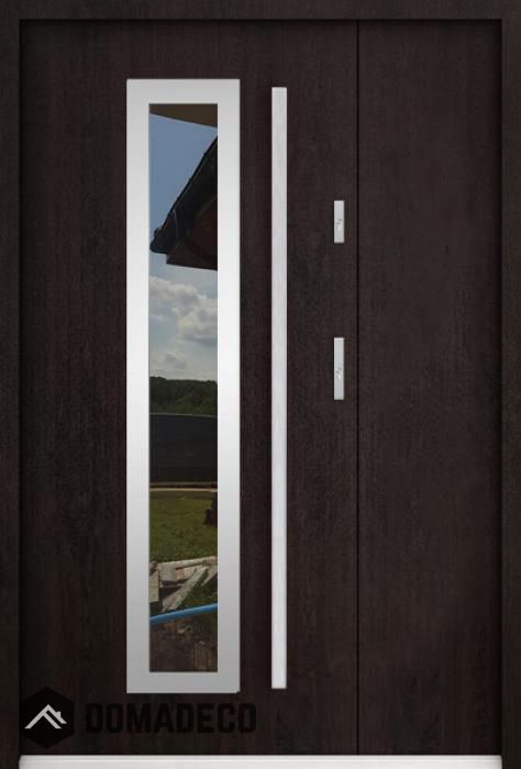 La porte est en acier inoxydable. À l'intérieur, il est rempli de mousse polyuréthane PUR et de bois. L'épaisseur du vantail de porte est de 55 mm. Double système d'étanchéité - un joint est dans le seuil du cadre et l'autre est situé dans la partie de support du vantail de porte. Ils réduisent les vibrations et protègent votre maison contre la perte de chaleur. Ils ne changent pas de volume sous l'influence des conditions atmosphériques. Le cadre de la porte est doté de renforts anti-effraction dans les pièces de charnière et les points de verrouillage.