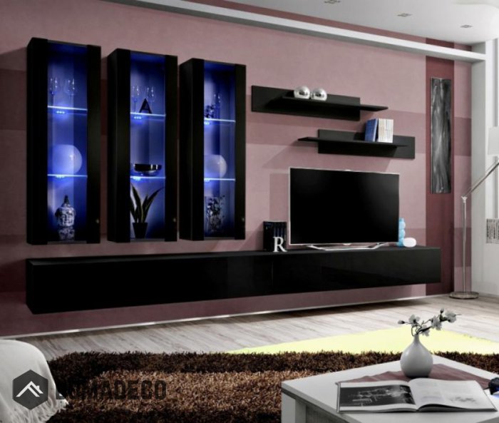 3x Un meuble vitrine avec une porte en bois et une en verre. Inclus : une tablette en verre, une tablette en bois et l'éclairage LED - 126/40/29 cm
