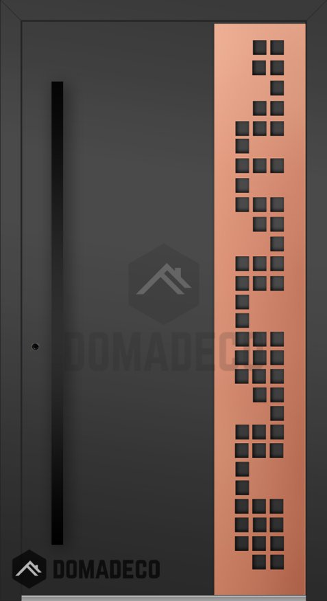 LIM C27 - porte d'entrée en aluminium recouverte d'une feuille de cuivre avec des carrés découpés