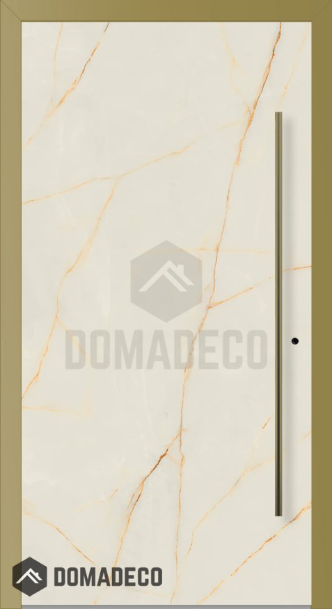 Les vantaux de la porte sont en quartz fritté. Le quartz fritté n'existe pas dans la nature, cependant la méthode qui permet d'obtenir ce matériau consiste à mélanger et à presser, entre autres, des argiles schisteuses, du sable quartzeux et des roches granitiques. La préparation ainsi obtenue est durcie par la cuisson. Les vantaux de porte en quartz fritté ont un style industriel et urbain, cependant ils sont également associés aux intérieurs raffinés et élégants.