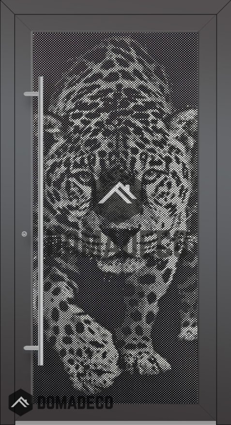 LIM G5 - Porte d'entrée vitrée en aluminium avec motif tigre dans le panneau décoratif