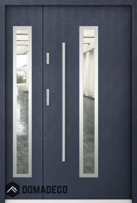 La porte est en acier inoxydable. À l'intérieur, il est rempli de mousse polyuréthane PUR et de bois. L'épaisseur du vantail de porte est de 55 mm. Double système d'étanchéité - un joint est dans le seuil du cadre et l'autre est situé dans la partie de support du vantail de porte. Ils réduisent les vibrations et protègent votre maison contre la perte de chaleur. Ils ne changent pas de volume sous l'influence des conditions atmosphériques. Le cadre de la porte est doté de renforts anti-effraction dans les pièces de charnière et les points de verrouillage.