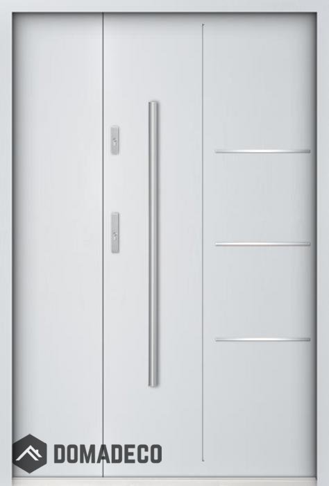 La porte est en acier inoxydable. À l'intérieur, il est rempli de mousse polyuréthane PUR et de bois. L'épaisseur du vantail de porte est de 55 mm. Double système d'étanchéité - un joint est dans le seuil du cadre et l'autre est situé dans la partie de support du vantail de porte. Ils réduisent les vibrations et protègent votre maison contre la perte de chaleur. Ils ne changent pas de volume sous l'influence des conditions atmosphériques. Le cadre de la porte est doté de renforts anti-effraction dans les pièces de charnière et les points de verrouillage.