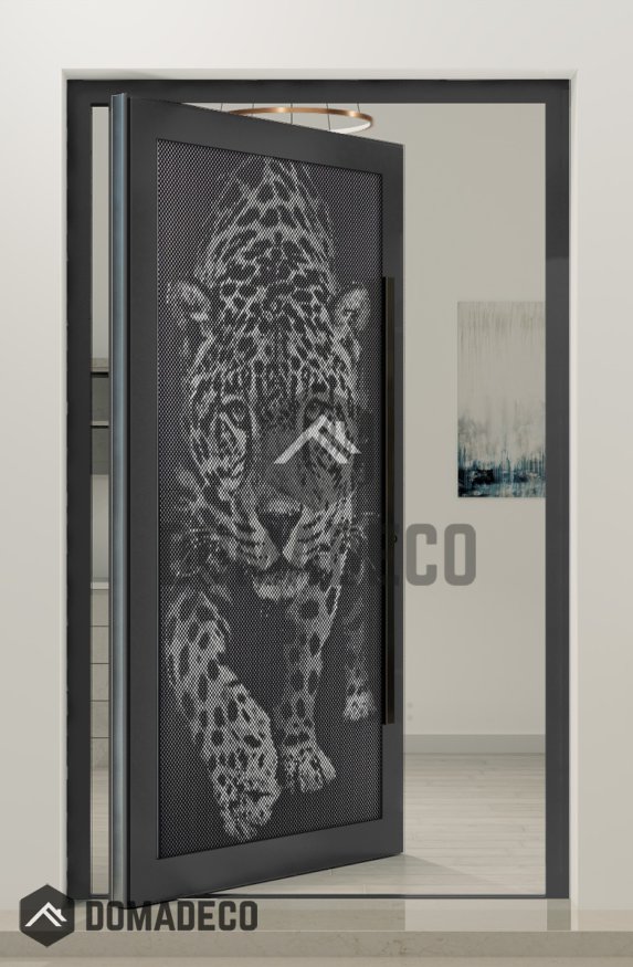 PIVOT G5 - Porte pivotante en verre et aluminium avec motif tigre sur panneau décoratif