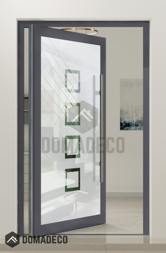 Fabriquée avec précision et souci du détail, la porte PIVOT Glass S2 présente une esthétique élégante et moderne qui ne manquera pas d'impressionner. Le mécanisme de pivotement unique permet à la porte de s'ouvrir sans effort et en douceur, ajoutant une touche de luxe à l'entrée de votre maison. Les deux bandes transparentes qui traversent les panneaux en verre dépoli ajoutent un élément de design subtil mais frappant qui distingue cette porte des entrées traditionnelles.