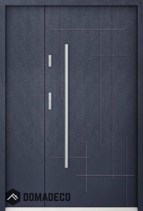La porte est en acier inoxydable. À l'intérieur, il est rempli de mousse polyuréthane PUR et de bois. L'épaisseur du vantail de porte est de 55 mm. Double système d'étanchéité - un joint est dans le seuil du cadre et l'autre est situé dans la partie de support du vantail de porte. Ils réduisent les vibrations et protègent votre maison contre la perte de chaleur. Ils ne changent pas de volume sous l'influence des conditions atmosphériques. Le cadre de la porte est doté de renforts anti-effraction dans les pièces de charnière et les points de verrouillage.
