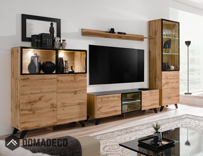 Placard mural haut: portes vitrées, 2 étagères intérieures vitrées avec lampe LED. Portes inférieures standard, 1 étagère intérieure standard (2 compartiments). Etagère. Meuble TV: 2 rabattants standards, 1 orifice intérieur. Abattant central vitré, 1 étagère intérieure avec lampe LED.