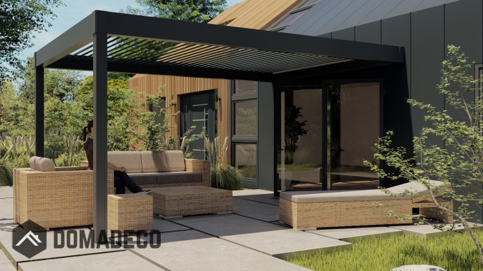 Le design innovant rend notre pergola adaptée à de nombreux types de bâtiments et de jardins, étant un élément décoratif luxueux de l'espace autour de la maison. Les lamelles mobiles, les vitrages latéraux et les panneaux de protection solaire offrent des possibilités d'agencement illimitées. Il satisfera même les goûts les plus sophistiqués.